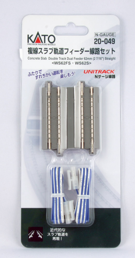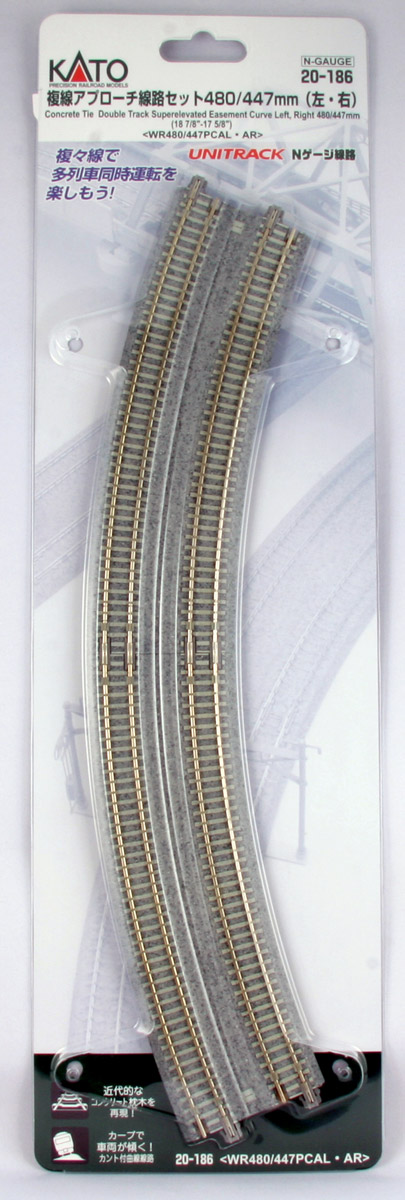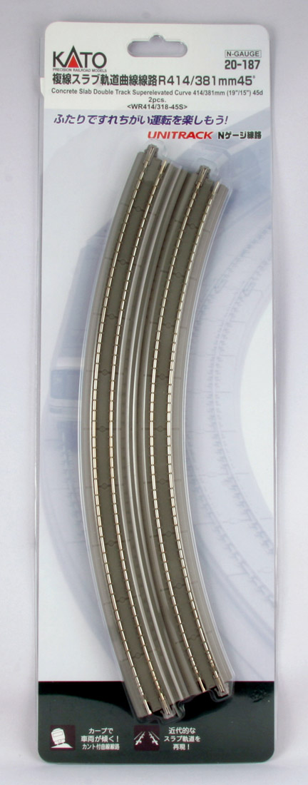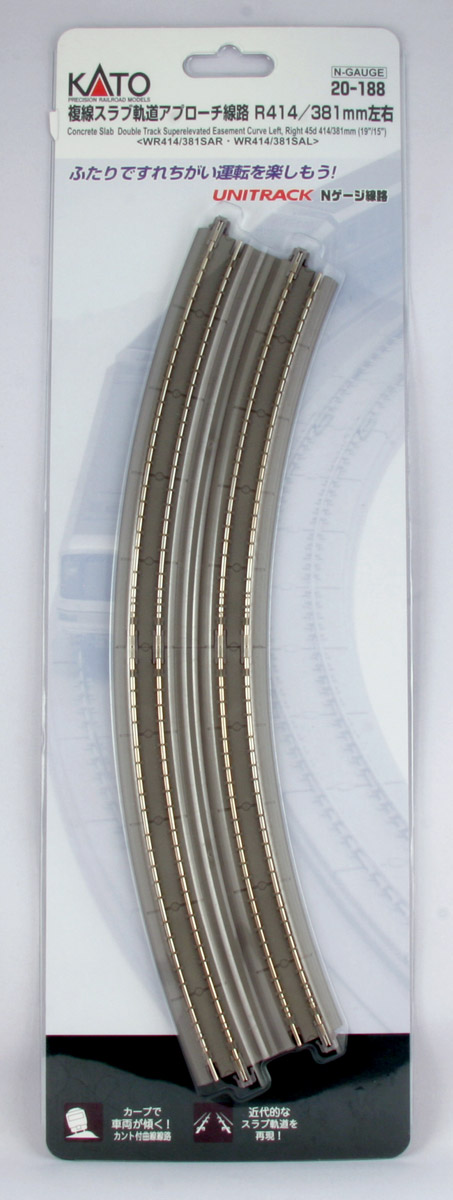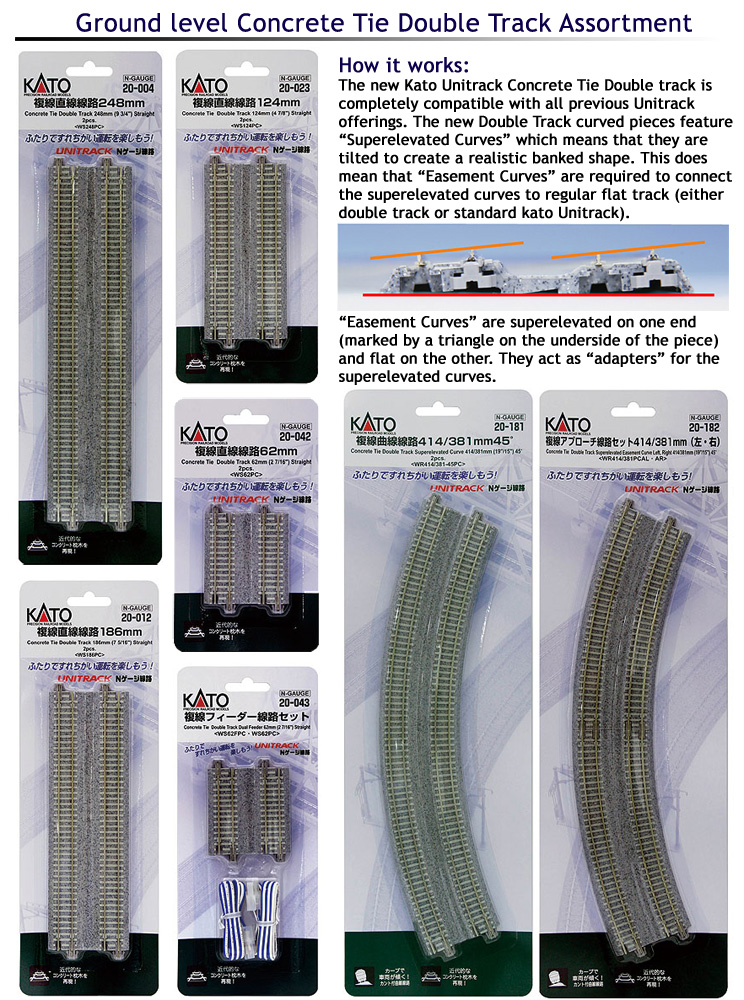 The next stage in realistic snap track – “Superelevation” is the term used to describe track in which one rail is higher than the other; much like a banked curve on a freeway offramp or a high speed corner in NASCAR, these banked curves are specially designed to reduce wheel wear and increase both comfort and safety in all manner of trains, fast or slow, passenger and freight. These superelevated curves are a standard installation in modern railroads, and before now they were complicated and finicky to replicate at model railroad scale level, but no longer! Kato UNITRACK makes it simple with modular easement and superelevated curves, available with modern pre-cast concrete ties (which not only modernize the look of your rails, but help differentiate the pieces at a glance from non-banked track pieces).